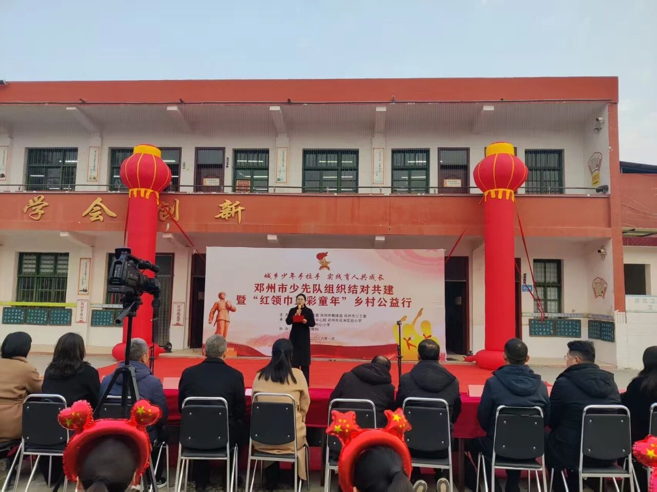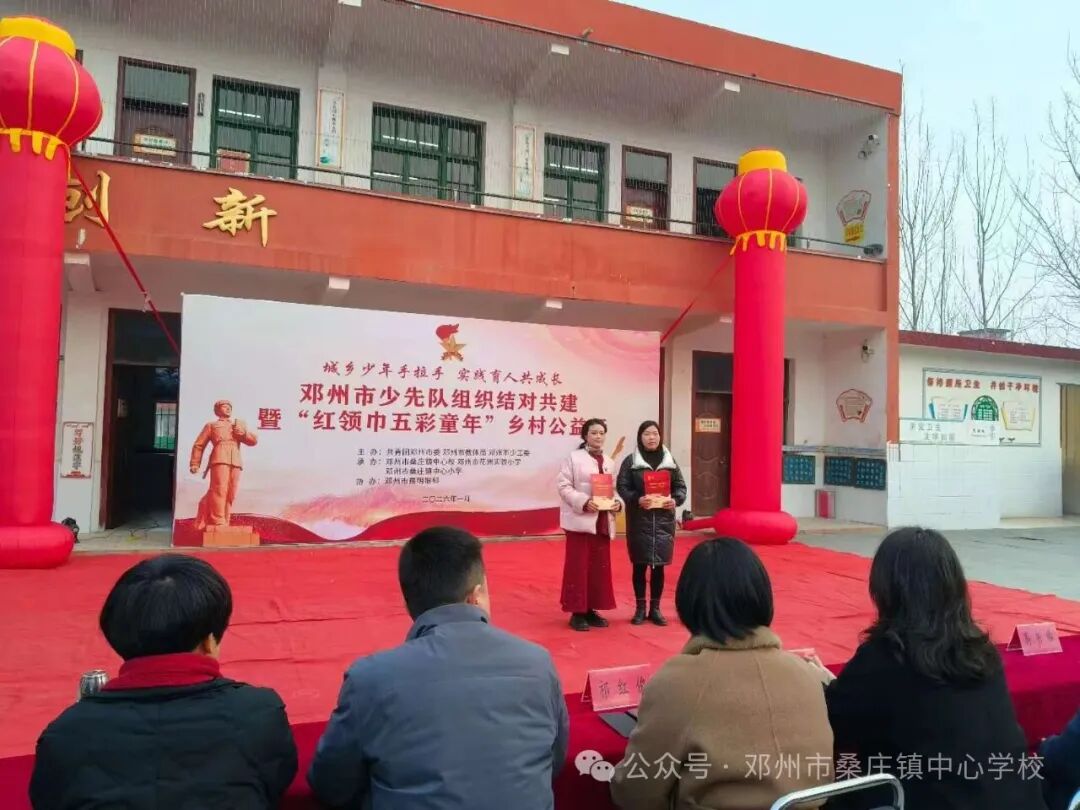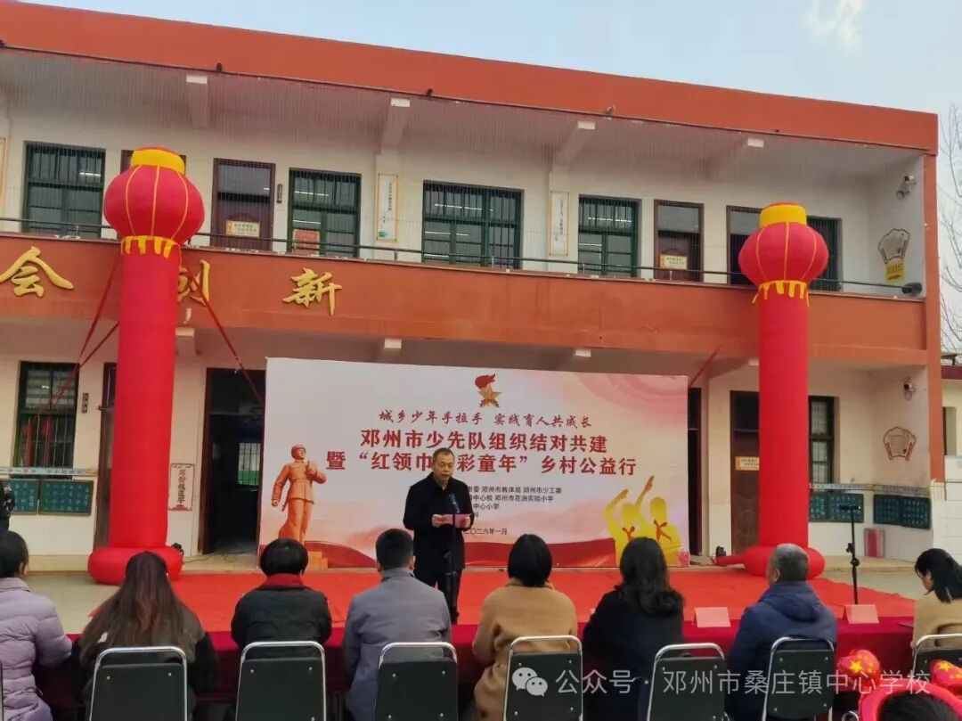 为深入学习践行雷锋精神,深化未成年人思想道德建设,推动城乡教育优质均衡发展,搭建少先队组织交流共建平台,1月14日上午,由共青团邓州市委、市教体局、市少工委主办,邓州市花洲实验小学、桑庄镇中心校联合承办的“城乡少年手拉手,实践育人共成长”少先队组织结对共建暨“红领巾五彩童年”乡村公益行活动启动仪式,在桑庄镇中心小学雷锋广场举行。